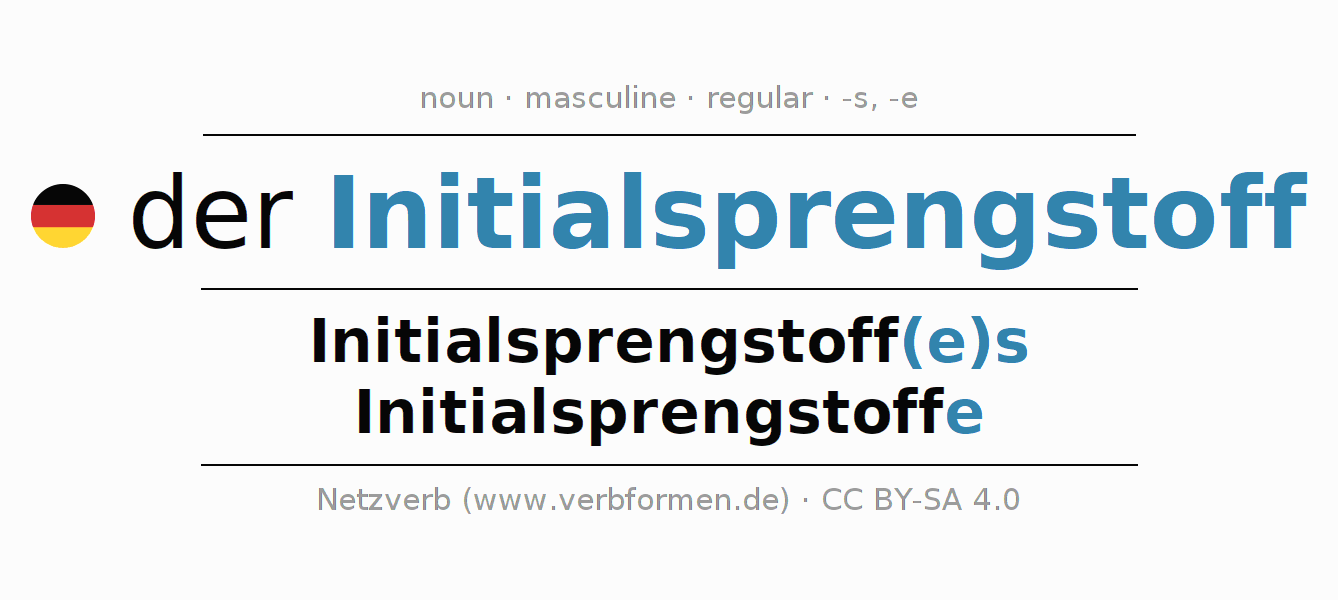 - Singular: der Initialsprengstoff, des Initialsprengstoff(e)s, dem Initialsprengstoff(e), den Initialsprengstoff
