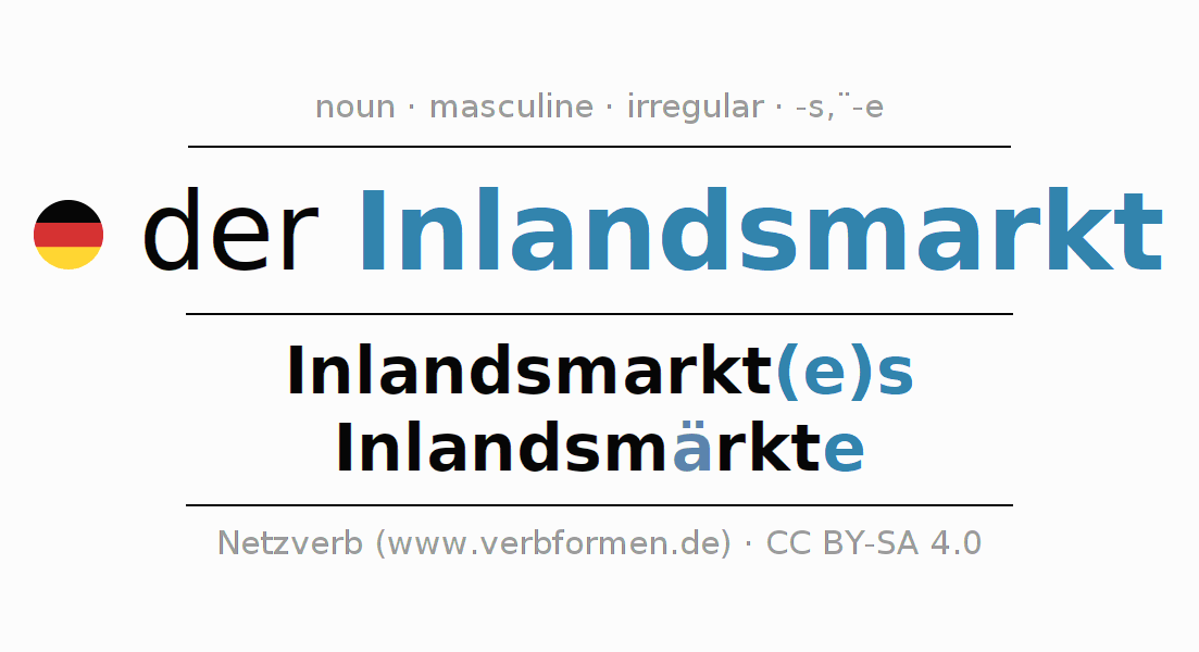 - Singular: der Inlandsmarkt, des Inlandsmarkt(e)s, dem Inlandsmarkt(e), den Inlandsmarkt