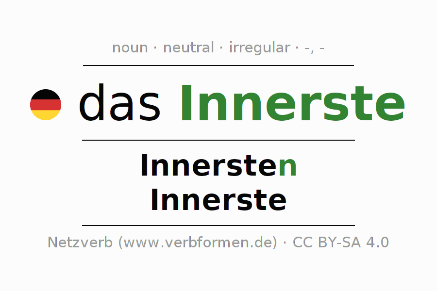 The declension of Innerste as a table with all forms in singular (singular) and plural (plural) and in all four cases nominative (1st case), genitive (2nd case), dative (3rd case) and accusative (4th case). Especially for German learners the correct declension of the word Innerste is crucial.