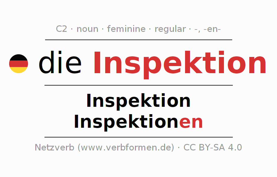 - Plural: die Inspektionen, der Inspektionen, den Inspektionen, die Inspektionen