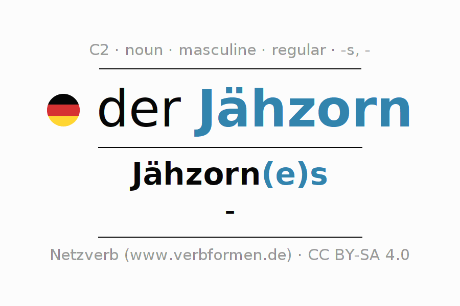 The declension of Jähzorn as a table with all forms in singular (singular) and plural (plural) and in all four cases nominative (1st case), genitive (2nd case), dative (3rd case) and accusative (4th case). Especially for German learners the correct declension of the word Jähzorn is crucial.