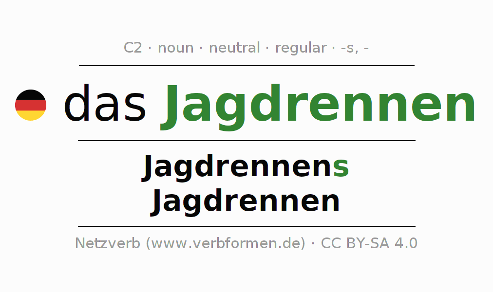 The declension of Jagdrennen as a table with all forms in singular (singular) and plural (plural) and in all four cases nominative (1st case), genitive (2nd case), dative (3rd case) and accusative (4th case). Especially for German learners the correct declension of the word Jagdrennen is crucial.