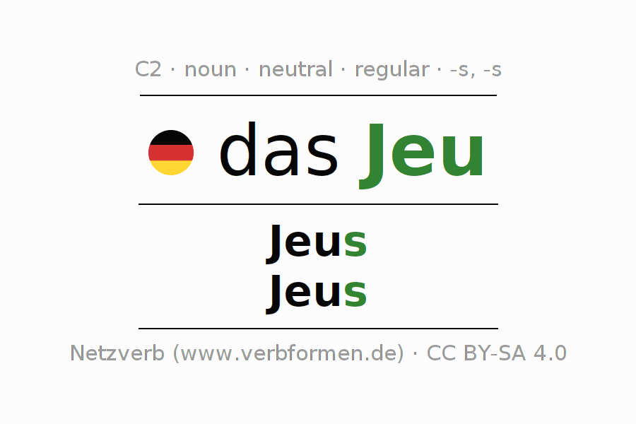 - Singular: das Jeu, des Jeus, dem Jeu, das Jeu