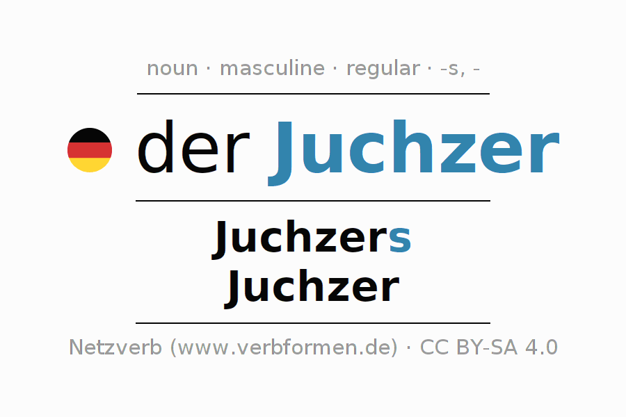 The declension of Juchzer as a table with all forms in singular (singular) and plural (plural) and in all four cases nominative (1st case), genitive (2nd case), dative (3rd case) and accusative (4th case). Especially for German learners the correct declension of the word Juchzer is crucial.