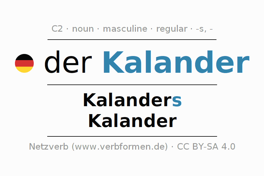 - Singular: der Kalander, des Kalanders, dem Kalander, den Kalander