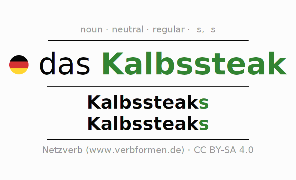 - Singular: das Kalbssteak, des Kalbssteaks, dem Kalbssteak, das Kalbssteak