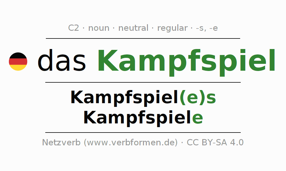 The declension of Kampfspiel as a table with all forms in singular (singular) and plural (plural) and in all four cases nominative (1st case), genitive (2nd case), dative (3rd case) and accusative (4th case). Especially for German learners the correct declension of the word Kampfspiel is crucial.
