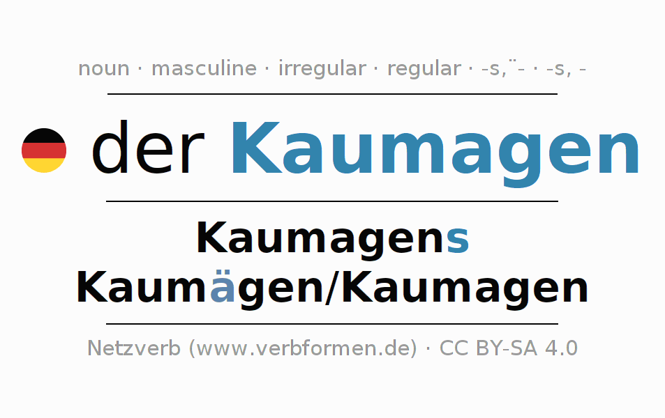 - Plural: die Kaumägen/Kaumagen, der Kaumägen/Kaumagen, den Kaumägen/Kaumagen, die Kaumägen/Kaumagen