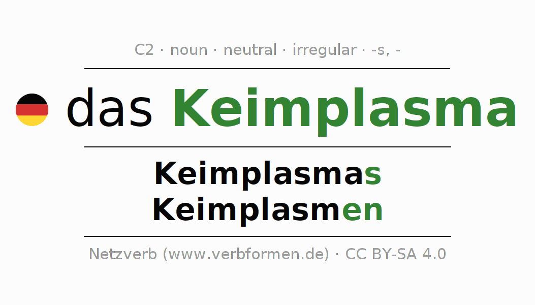 The declension of Keimplasma as a table with all forms in singular (singular) and plural (plural) and in all four cases nominative (1st case), genitive (2nd case), dative (3rd case) and accusative (4th case). Especially for German learners the correct declension of the word Keimplasma is crucial.