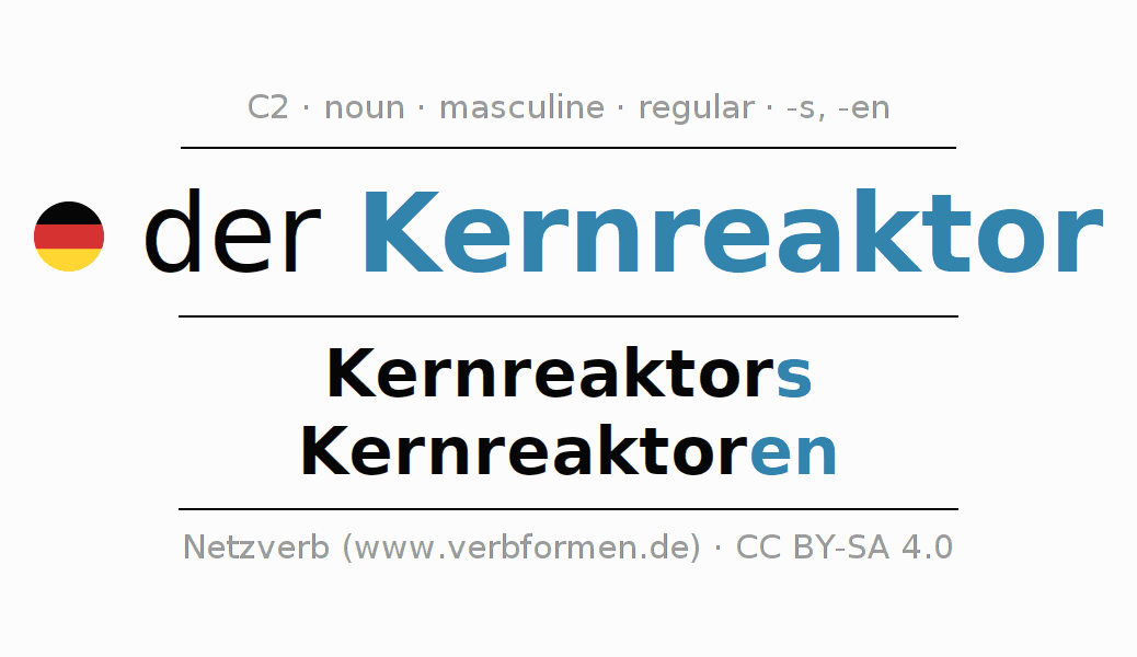 The declension of Kernreaktor as a table with all forms in singular (singular) and plural (plural) and in all four cases nominative (1st case), genitive (2nd case), dative (3rd case) and accusative (4th case). Especially for German learners the correct declension of the word Kernreaktor is crucial.