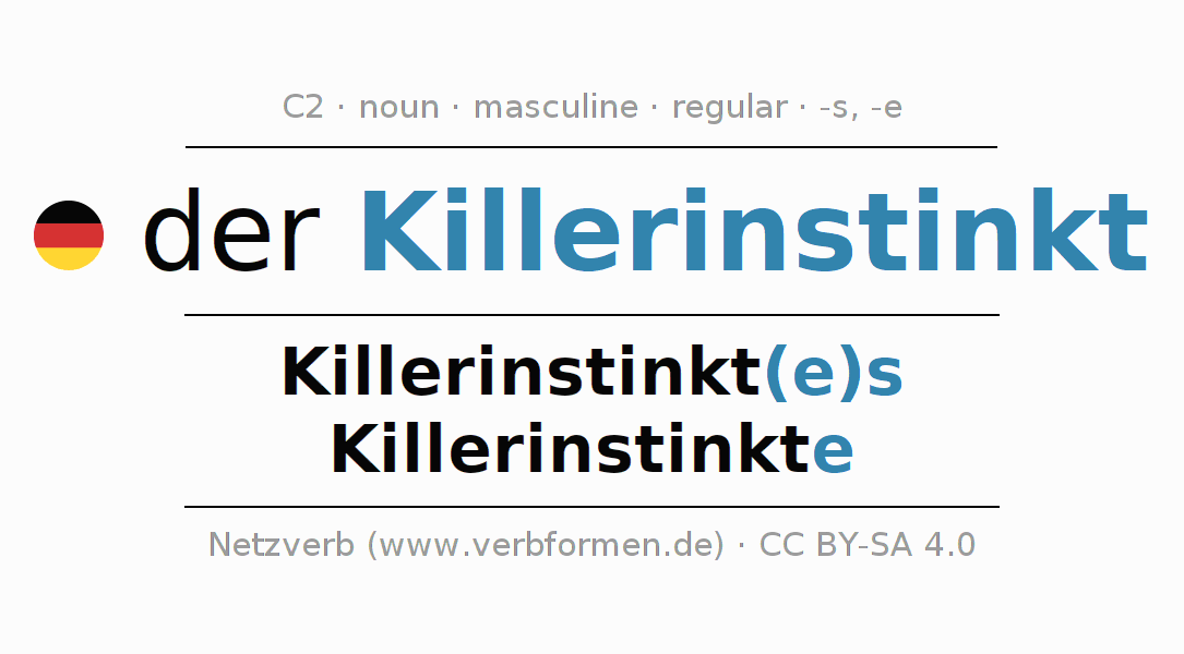 The declension of Killerinstinkt as a table with all forms in singular (singular) and plural (plural) and in all four cases nominative (1st case), genitive (2nd case), dative (3rd case) and accusative (4th case). Especially for German learners the correct declension of the word Killerinstinkt is crucial.