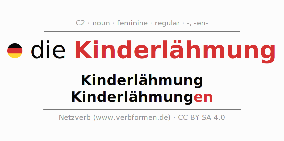 The declension of Kinderlähmung as a table with all forms in singular (singular) and plural (plural) and in all four cases nominative (1st case), genitive (2nd case), dative (3rd case) and accusative (4th case). Especially for German learners the correct declension of the word Kinderlähmung is crucial.