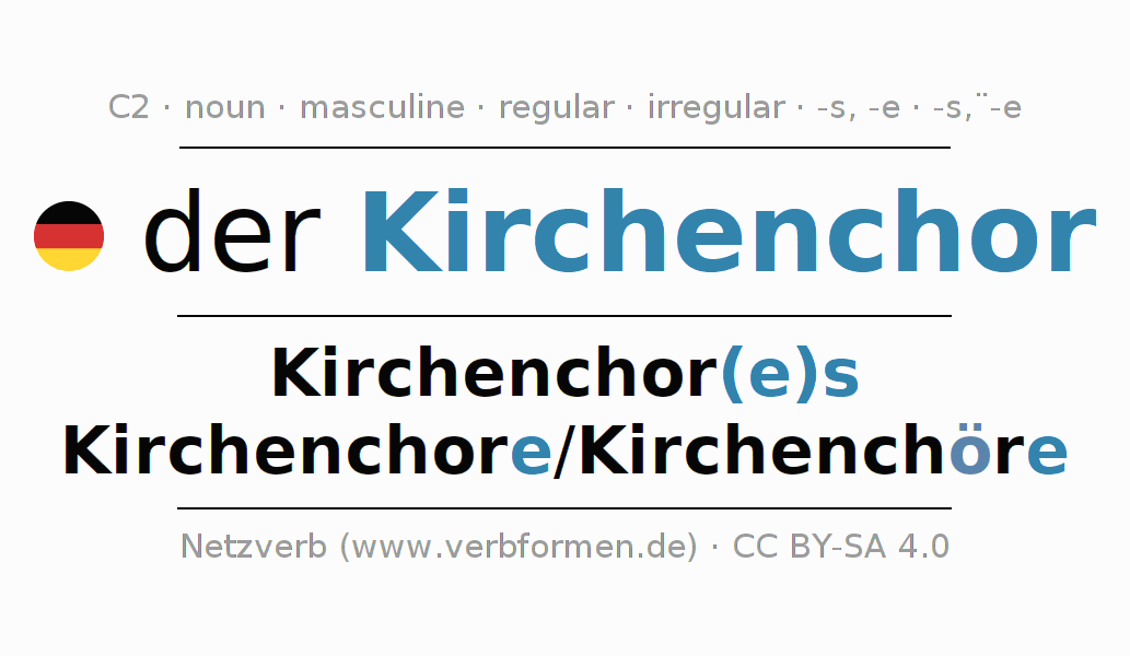 The declension of Kirchenchor as a table with all forms in singular (singular) and plural (plural) and in all four cases nominative (1st case), genitive (2nd case), dative (3rd case) and accusative (4th case). Especially for German learners the correct declension of the word Kirchenchor is crucial.