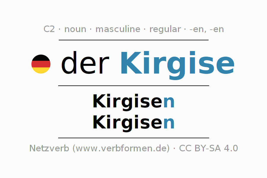 - Singular: der Kirgise, des Kirgisen, dem Kirgisen, den Kirgisen