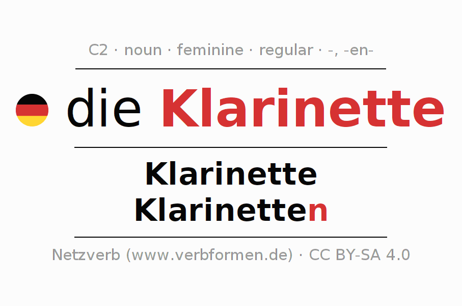 The declension of Klarinette as a table with all forms in singular (singular) and plural (plural) and in all four cases nominative (1st case), genitive (2nd case), dative (3rd case) and accusative (4th case). Especially for German learners the correct declension of the word Klarinette is crucial.