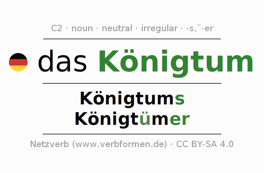 - Plural: die Königtümer, der Königtümer, den Königtümern, die Königtümer