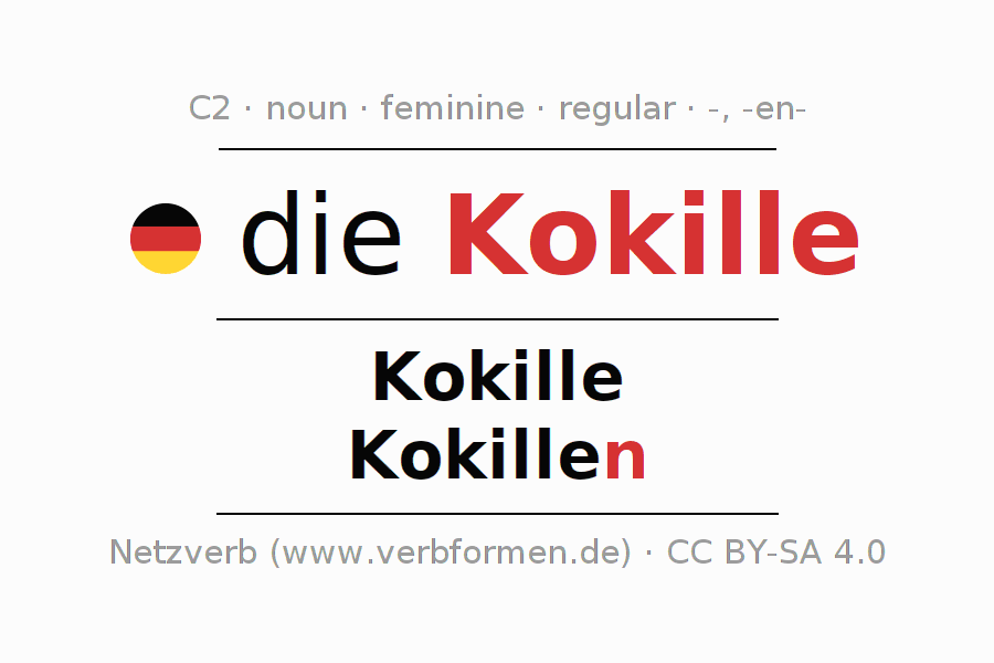 The declension of Kokille as a table with all forms in singular (singular) and plural (plural) and in all four cases nominative (1st case), genitive (2nd case), dative (3rd case) and accusative (4th case). Especially for German learners the correct declension of the word Kokille is crucial.