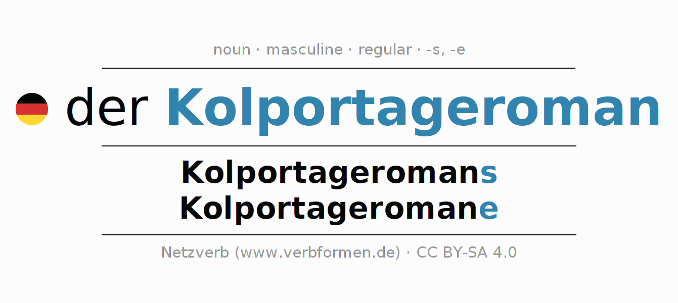 - Singular: der Kolportageroman, des Kolportageromans, dem Kolportageroman, den Kolportageroman