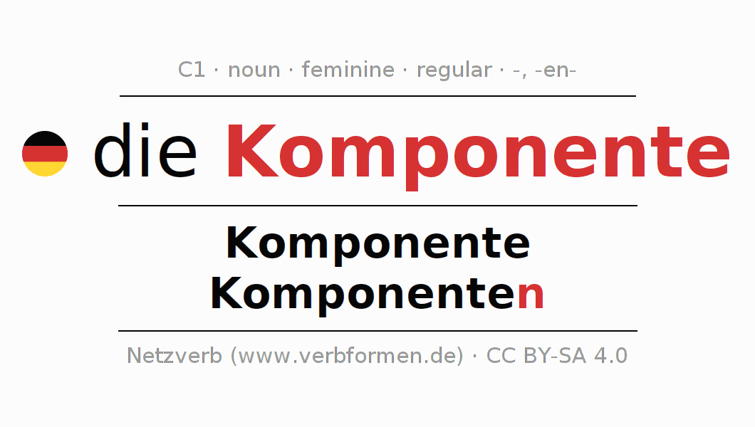 - Plural: die Komponenten, der Komponenten, den Komponenten, die Komponenten