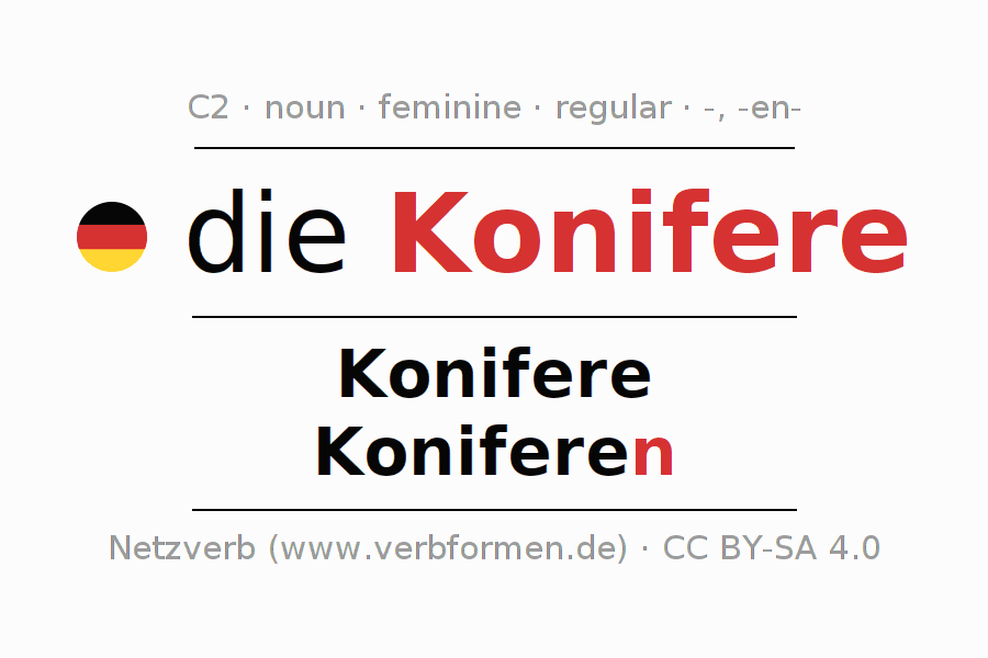 - Plural: die Koniferen, der Koniferen, den Koniferen, die Koniferen