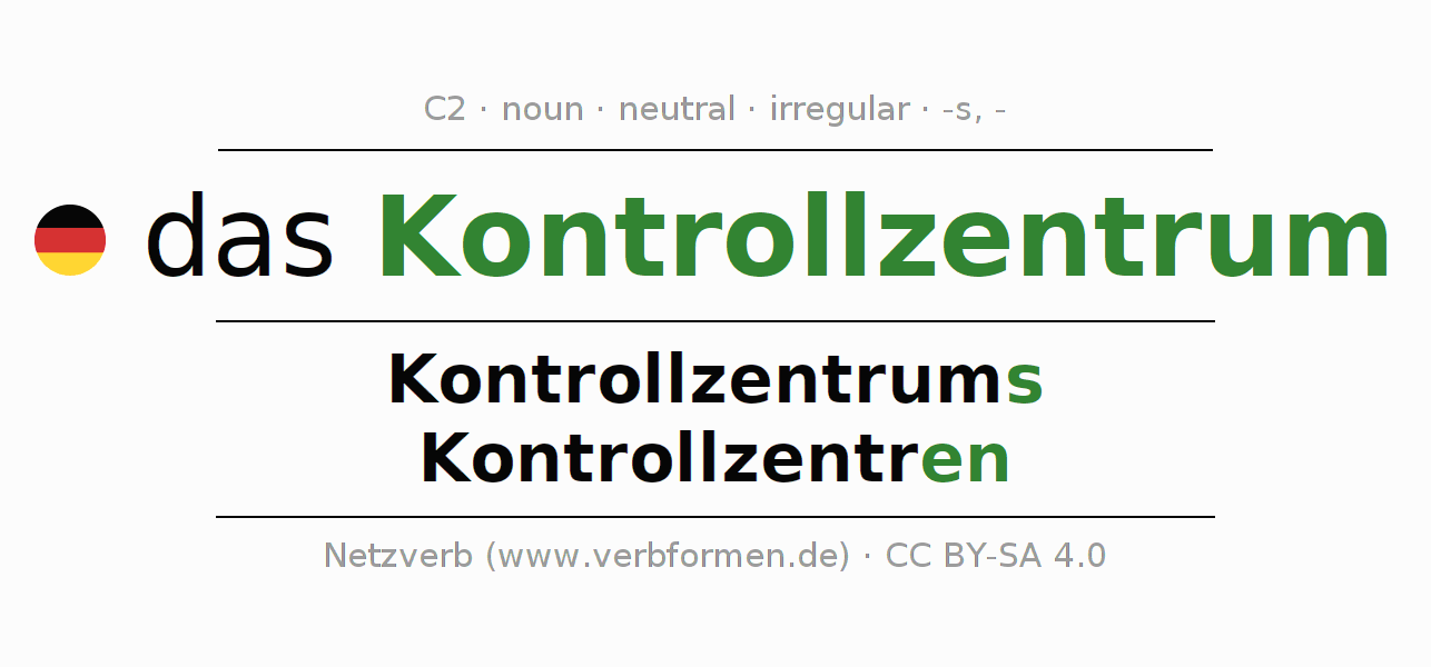 - Singular: das Kontrollzentrum, des Kontrollzentrums, dem Kontrollzentrum, das Kontrollzentrum