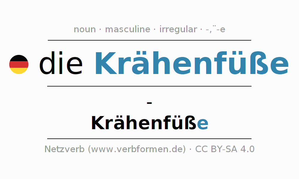 - Plural: die Krähenfüße, der Krähenfüße, den Krähenfüßen, die Krähenfüße