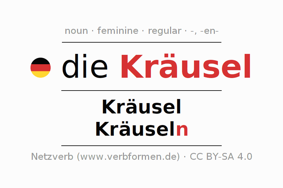 The declension of Kräusel as a table with all forms in singular (singular) and plural (plural) and in all four cases nominative (1st case), genitive (2nd case), dative (3rd case) and accusative (4th case). Especially for German learners the correct declension of the word Kräusel is crucial.