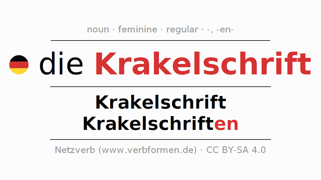 The declension of Krakelschrift as a table with all forms in singular (singular) and plural (plural) and in all four cases nominative (1st case), genitive (2nd case), dative (3rd case) and accusative (4th case). Especially for German learners the correct declension of the word Krakelschrift is crucial.