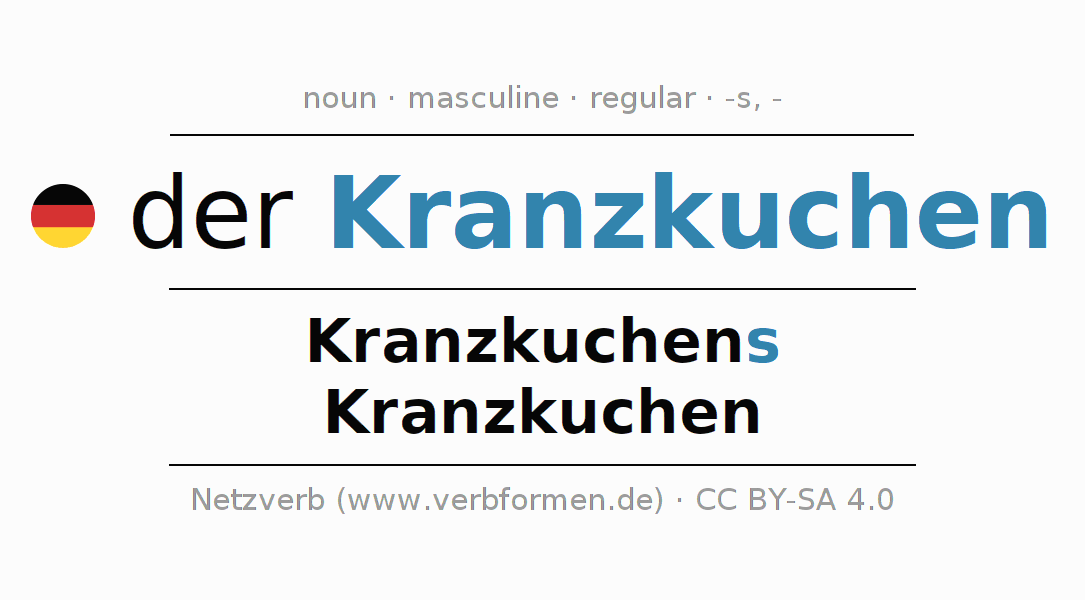 The declension of the noun Kranzkuchen (ring cake) is in singular genitive Kranzkuchens and in the plural nominative Kranzkuchen. The noun Kranzkuchen is declined with the declension endings s/-. The voice of Kranzkuchen is maskuline and the article "der". Here you can not only inflect Kranzkuchen but also all German nouns. Comments ☆