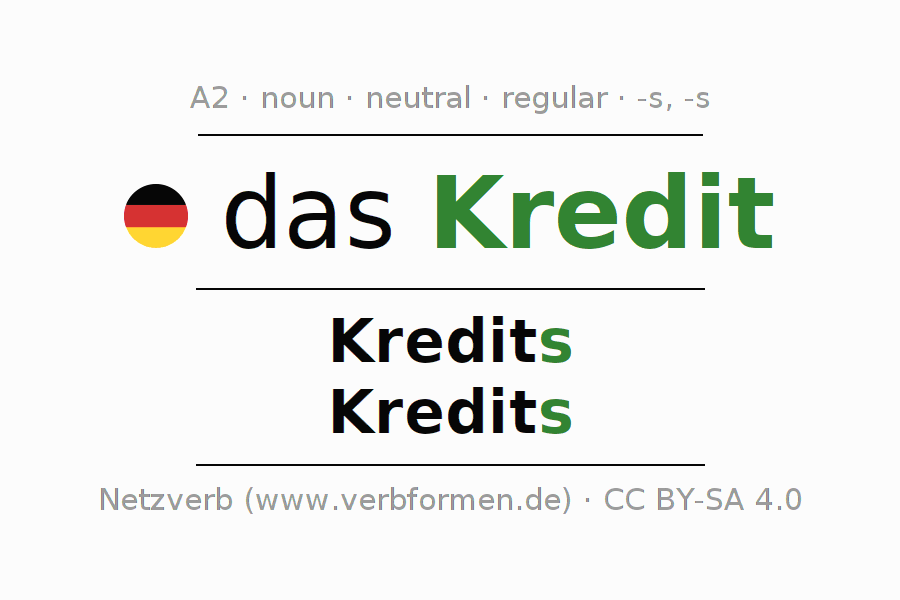 - Singular: das Kredit, des Kredits, dem Kredit, das Kredit