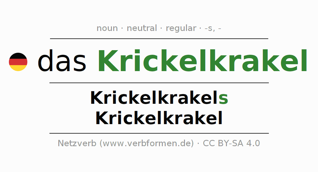 The declension of Krickelkrakel as a table with all forms in singular (singular) and plural (plural) and in all four cases nominative (1st case), genitive (2nd case), dative (3rd case) and accusative (4th case). Especially for German learners the correct declension of the word Krickelkrakel is crucial.