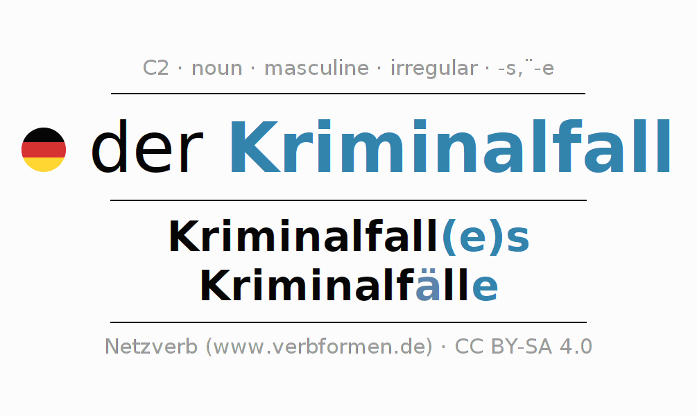 - Plural: die Kriminalfälle, der Kriminalfälle, den Kriminalfällen, die Kriminalfälle
