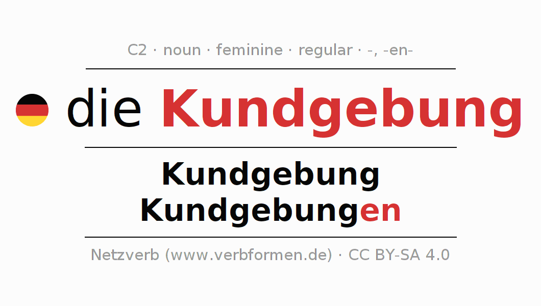 The declension of Kundgebung as a table with all forms in singular (singular) and plural (plural) and in all four cases nominative (1st case), genitive (2nd case), dative (3rd case) and accusative (4th case). Especially for German learners the correct declension of the word Kundgebung is crucial.