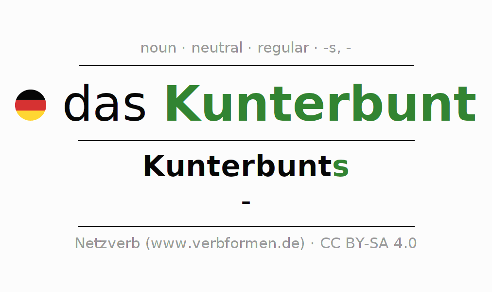 The declension of the noun Kunterbunt (colorful chaos, hodgepodge) is in singular genitive Kunterbunts and in the plural nominative -. The noun Kunterbunt is declined with the declension endings s/-. It does not form plurals. The voice of Kunterbunt is neutral and the article "das". Here you can not only inflect Kunterbunt but also all German nouns. Comments ☆