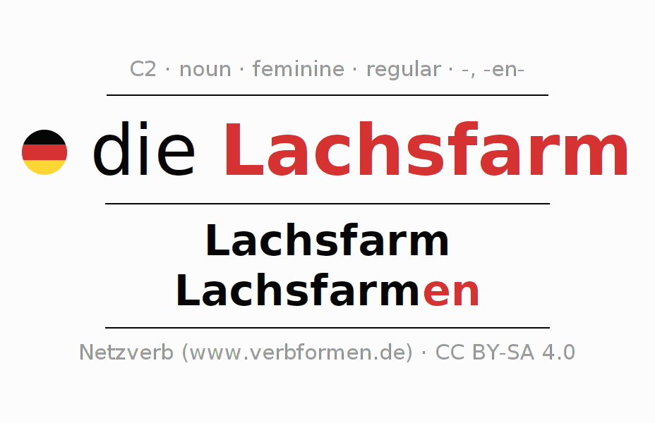 - Plural: die Lachsfarmen, der Lachsfarmen, den Lachsfarmen, die Lachsfarmen
