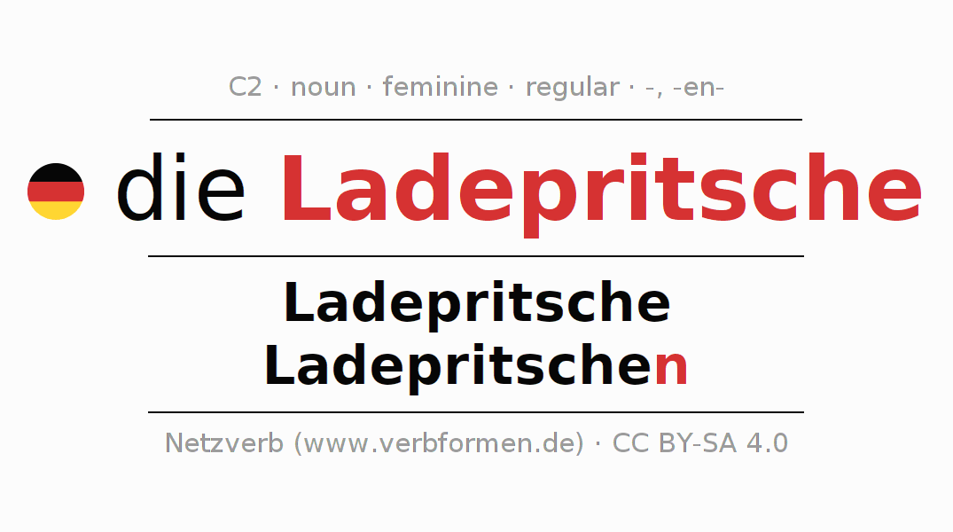 The declension of Ladepritsche as a table with all forms in singular (singular) and plural (plural) and in all four cases nominative (1st case), genitive (2nd case), dative (3rd case) and accusative (4th case). Especially for German learners the correct declension of the word Ladepritsche is crucial.