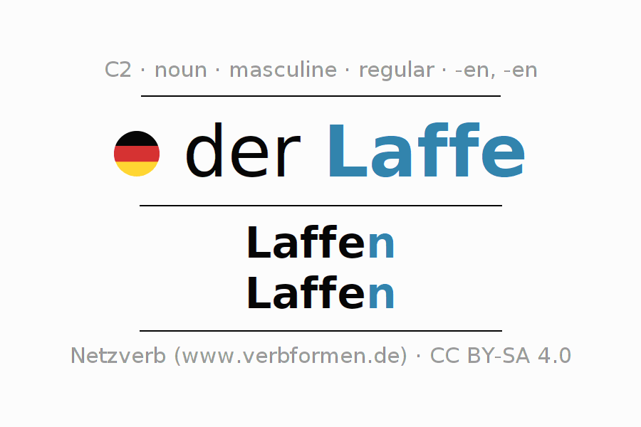 The declension of Laffe as a table with all forms in singular (singular) and plural (plural) and in all four cases nominative (1st case), genitive (2nd case), dative (3rd case) and accusative (4th case). Especially for German learners the correct declension of the word Laffe is crucial.