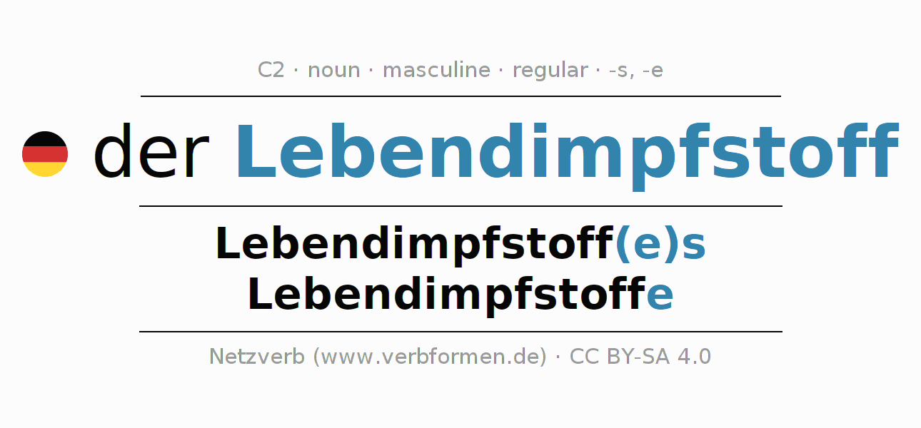 - Singular: der Lebendimpfstoff, des Lebendimpfstoff(e)s, dem Lebendimpfstoff(e), den Lebendimpfstoff