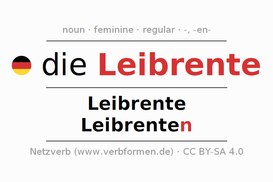 The declension of Leibrente as a table with all forms in singular (singular) and plural (plural) and in all four cases nominative (1st case), genitive (2nd case), dative (3rd case) and accusative (4th case). Especially for German learners the correct declension of the word Leibrente is crucial.