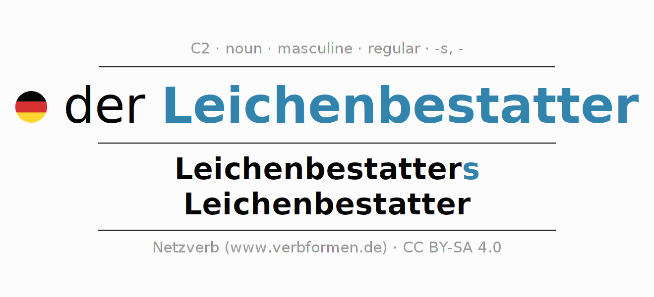 The declension of Leichenbestatter as a table with all forms in singular (singular) and plural (plural) and in all four cases nominative (1st case), genitive (2nd case), dative (3rd case) and accusative (4th case). Especially for German learners the correct declension of the word Leichenbestatter is crucial.
