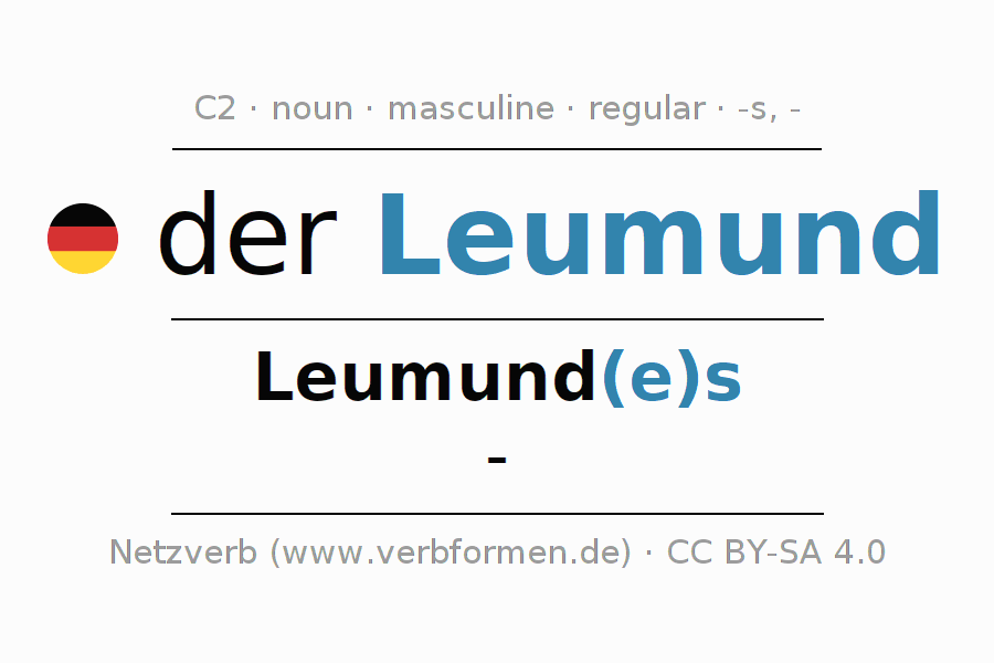 The declension of Leumund as a table with all forms in singular (singular) and plural (plural) and in all four cases nominative (1st case), genitive (2nd case), dative (3rd case) and accusative (4th case). Especially for German learners the correct declension of the word Leumund is crucial.