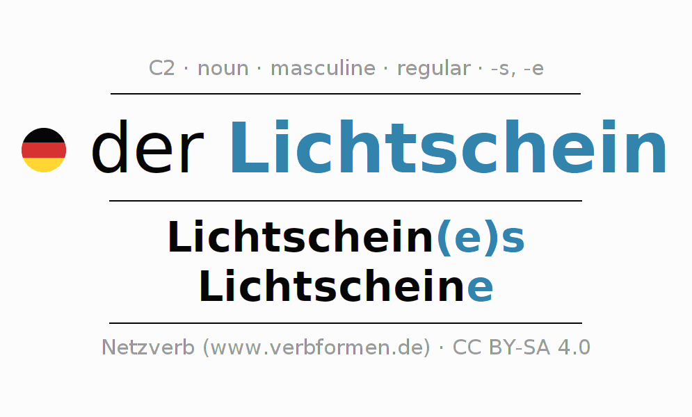 The declension of Lichtschein as a table with all forms in singular (singular) and plural (plural) and in all four cases nominative (1st case), genitive (2nd case), dative (3rd case) and accusative (4th case). Especially for German learners the correct declension of the word Lichtschein is crucial.