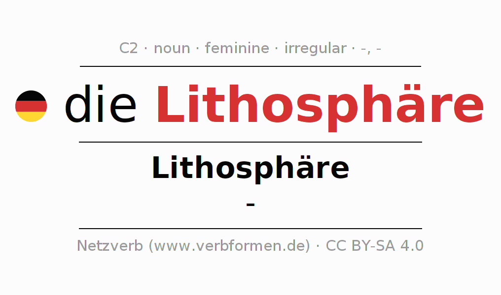 The declension of Lithosphäre as a table with all forms in singular (singular) and plural (plural) and in all four cases nominative (1st case), genitive (2nd case), dative (3rd case) and accusative (4th case). Especially for German learners the correct declension of the word Lithosphäre is crucial.
