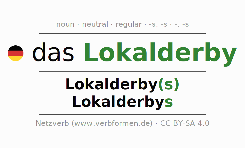 The declension of Lokalderby as a table with all forms in singular (singular) and plural (plural) and in all four cases nominative (1st case), genitive (2nd case), dative (3rd case) and accusative (4th case). Especially for German learners the correct declension of the word Lokalderby is crucial.