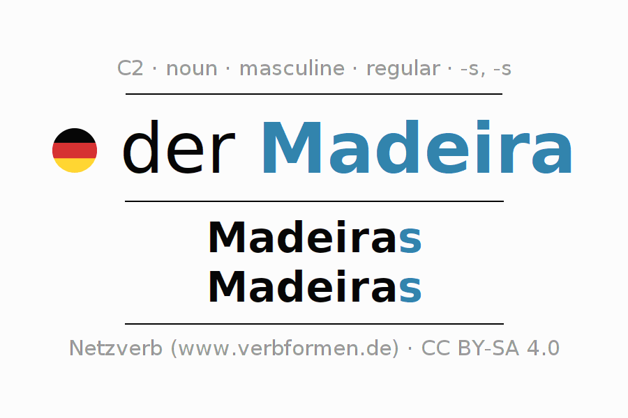 - Singular: der Madeira, des Madeiras, dem Madeira, den Madeira