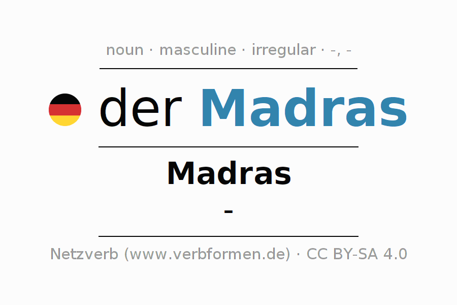 The declension of Madras as a table with all forms in singular (singular) and plural (plural) and in all four cases nominative (1st case), genitive (2nd case), dative (3rd case) and accusative (4th case). Especially for German learners the correct declension of the word Madras is crucial.