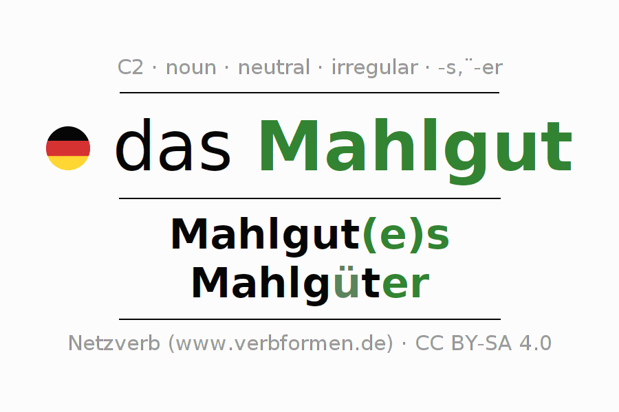 - Plural: die Mahlgüter, der Mahlgüter, den Mahlgütern, die Mahlgüter