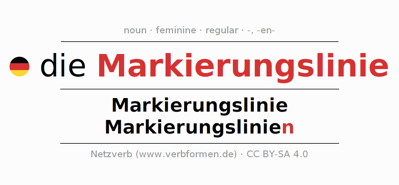 - Plural: die Markierungslinien, der Markierungslinien, den Markierungslinien, die Markierungslinien