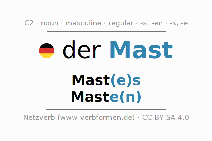 - Singular: der Mast, des Mast(e)s, dem Mast(e), den Mast