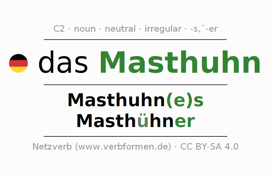 - Plural: die Masthühner, der Masthühner, den Masthühnern, die Masthühner